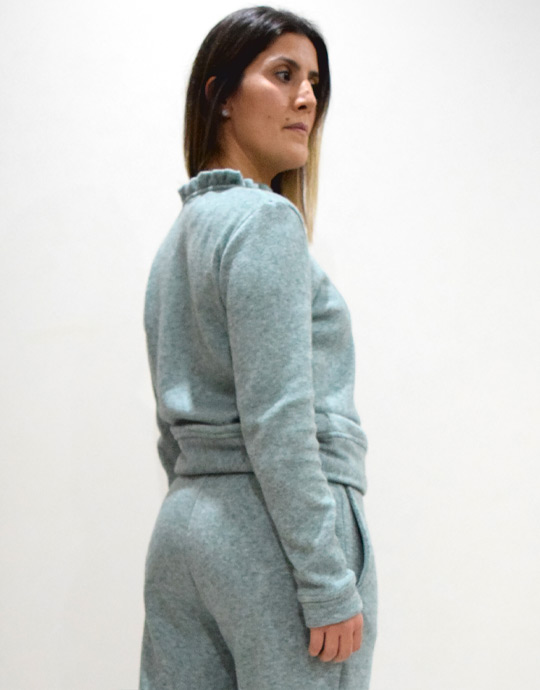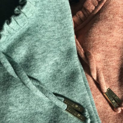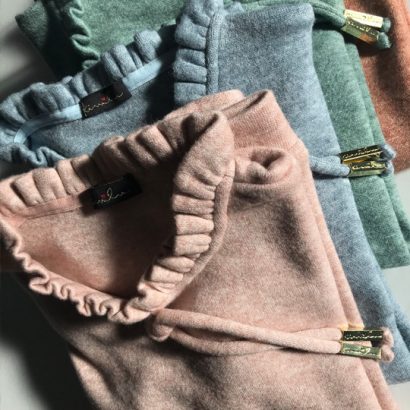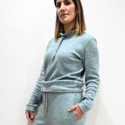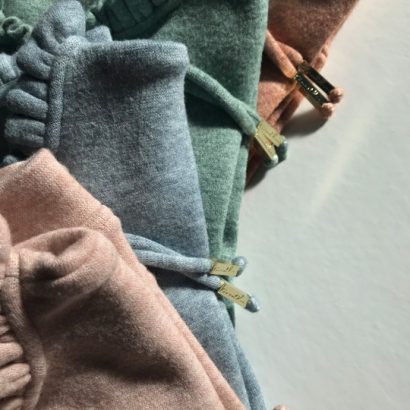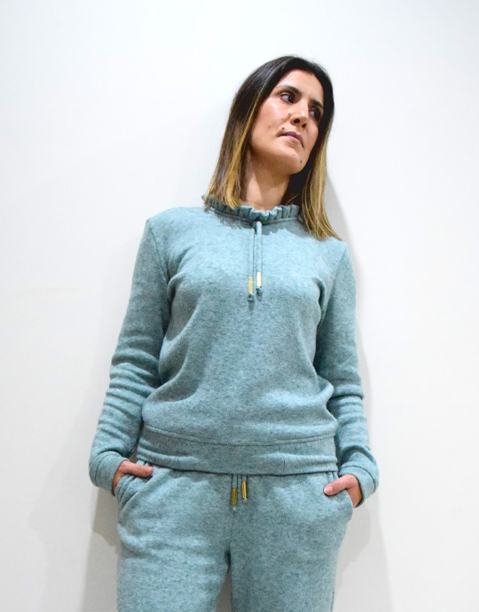 - Cordões decorativos confecionados com a mesma malha da peça;