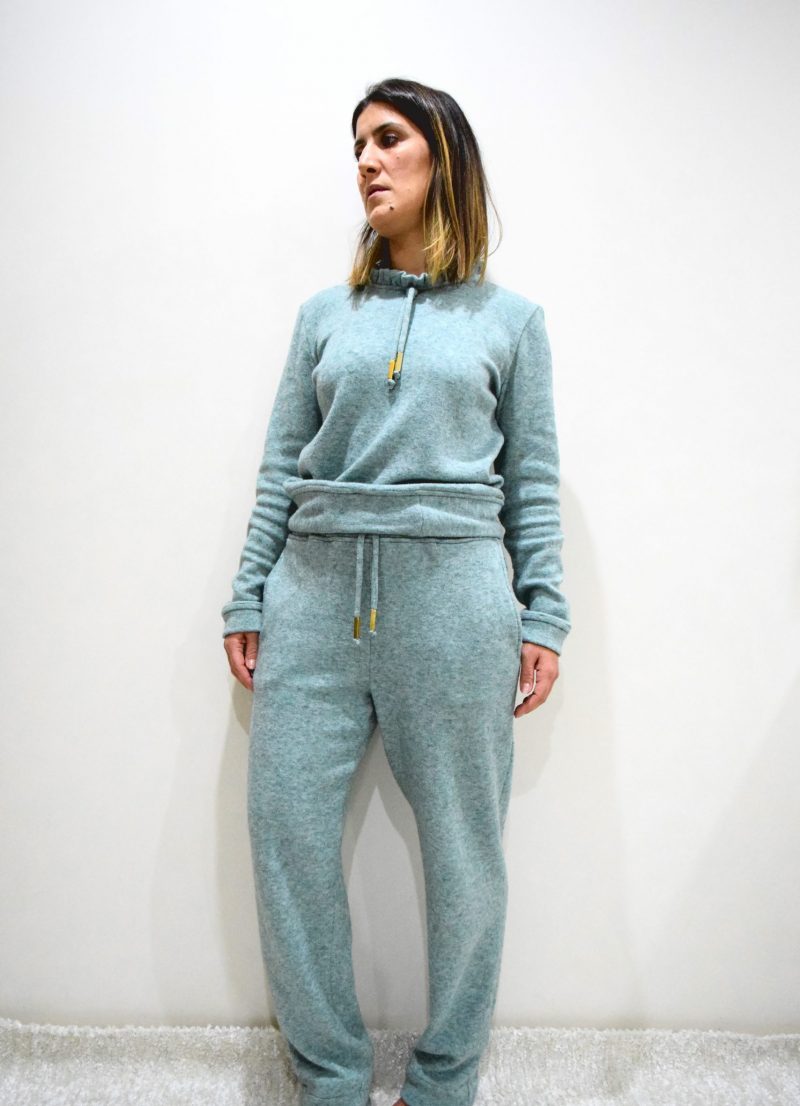 - Cordões decorativos confecionados com a mesma malha da peça;