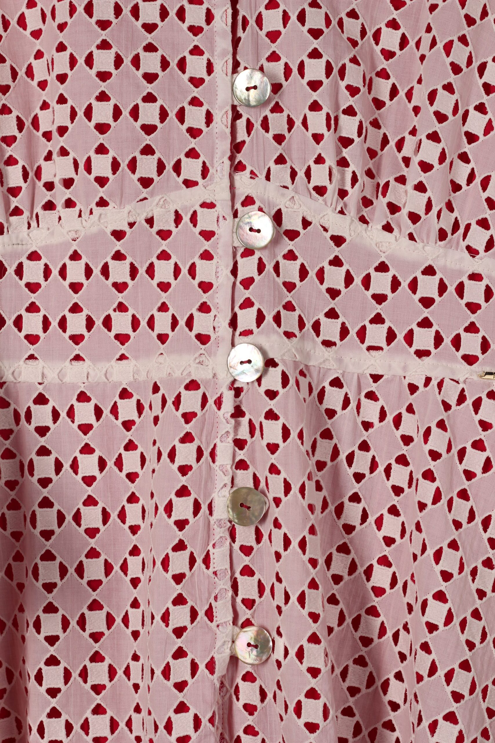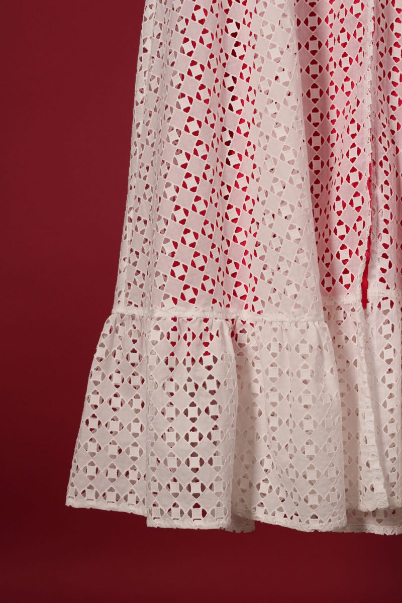 Vestido em renda branca, com forro chiffon rosa choque