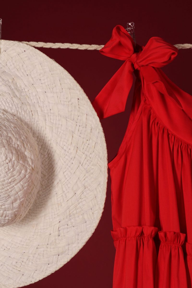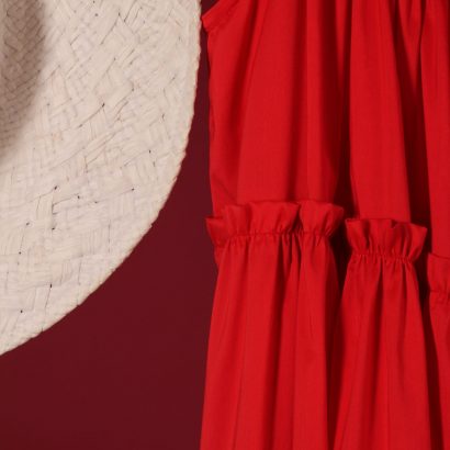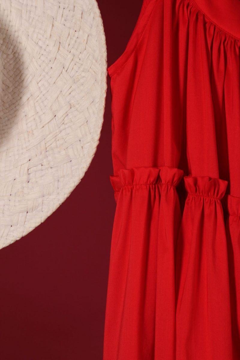 Vestido vermelho de sarginha fina com folhos e laços nos ombros