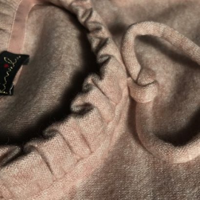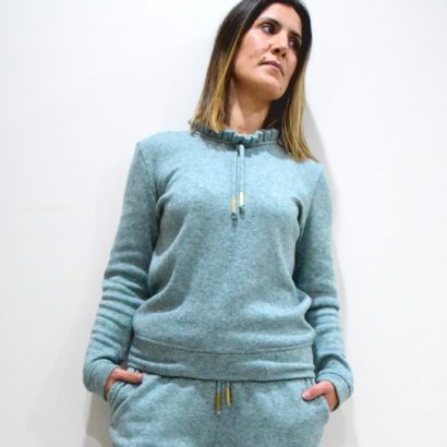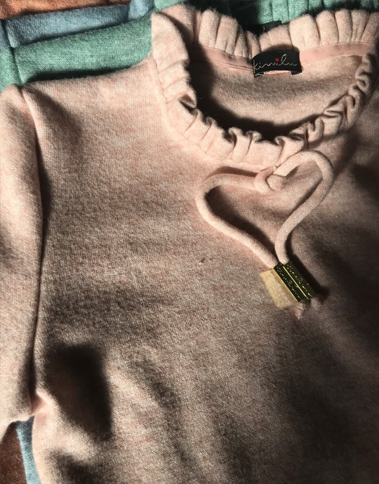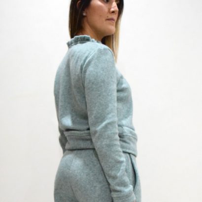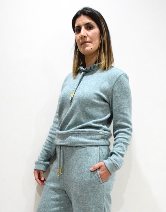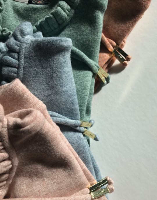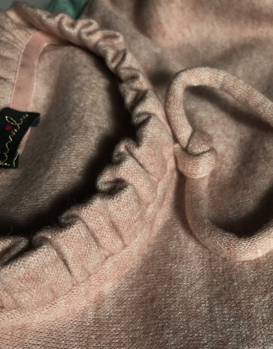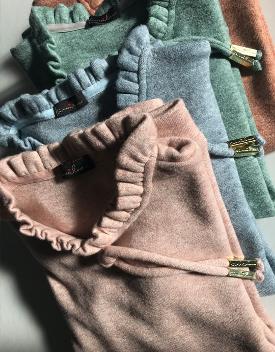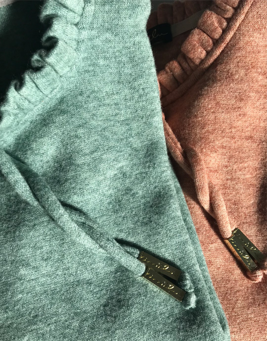 - Cordões decorativos confecionados com a mesma malha da peça;