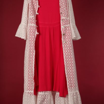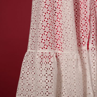 Vestido em renda branca, com forro chiffon rosa choque