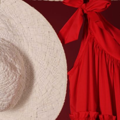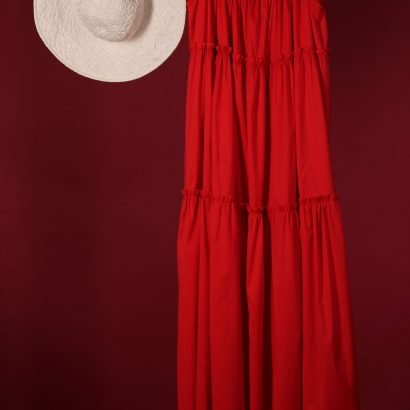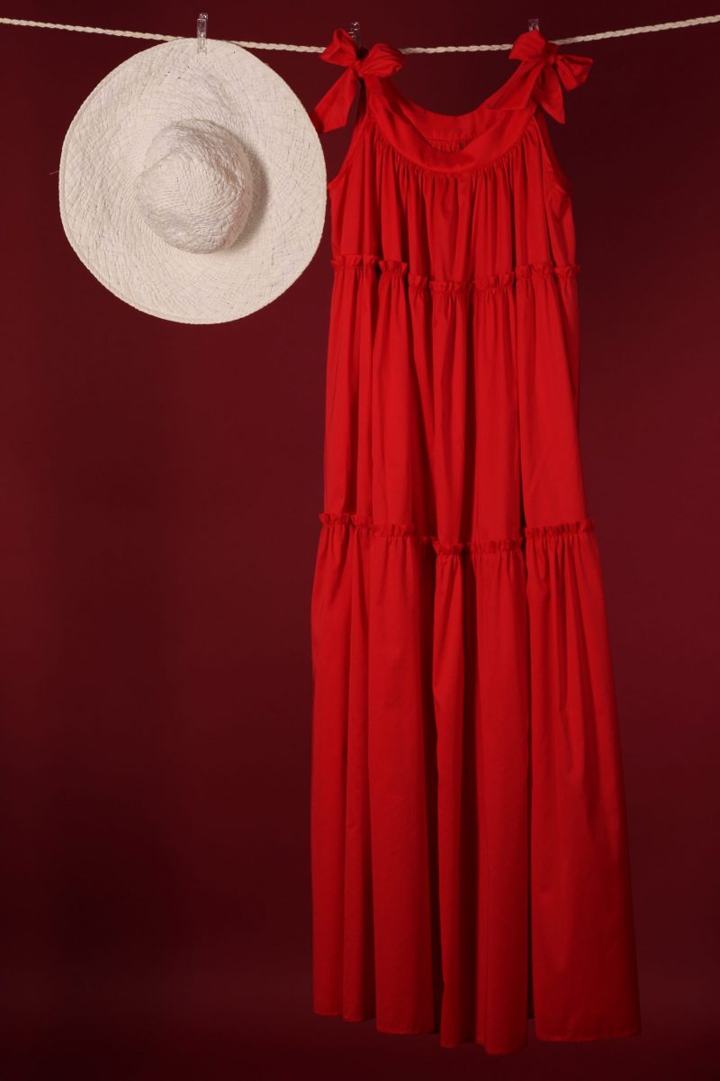 Vestido vermelho de sarginha fina com folhos e laços nos ombros